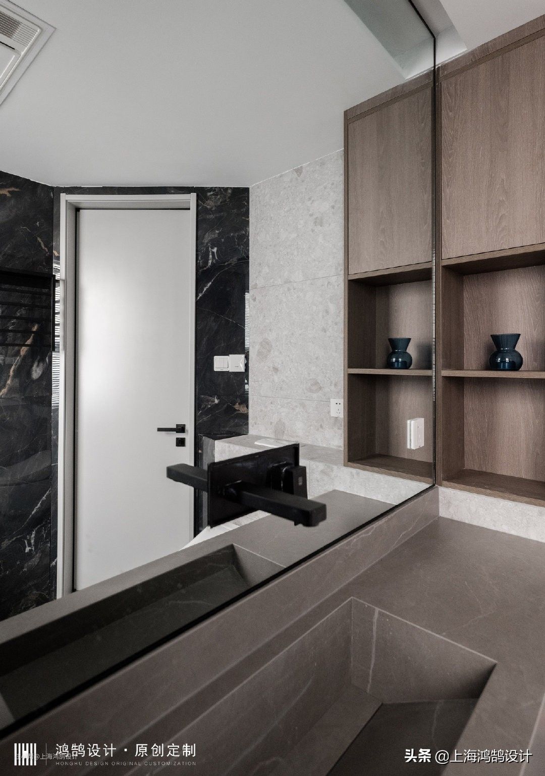 卫生间用了整屋的黑色鎏金砖,搭配了水磨石地砖,为了防止压抑,所以在镜子上做了整面镜,扩大了空间的纵深。