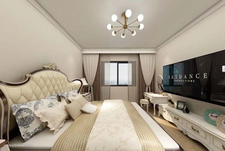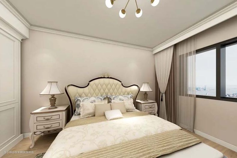 主卧摒弃太复杂的设计,整体延续简约美式风,考虑到老人安全问题,床品和电视柜都选用有弧度的轮廓,防止老人走路磕碰。