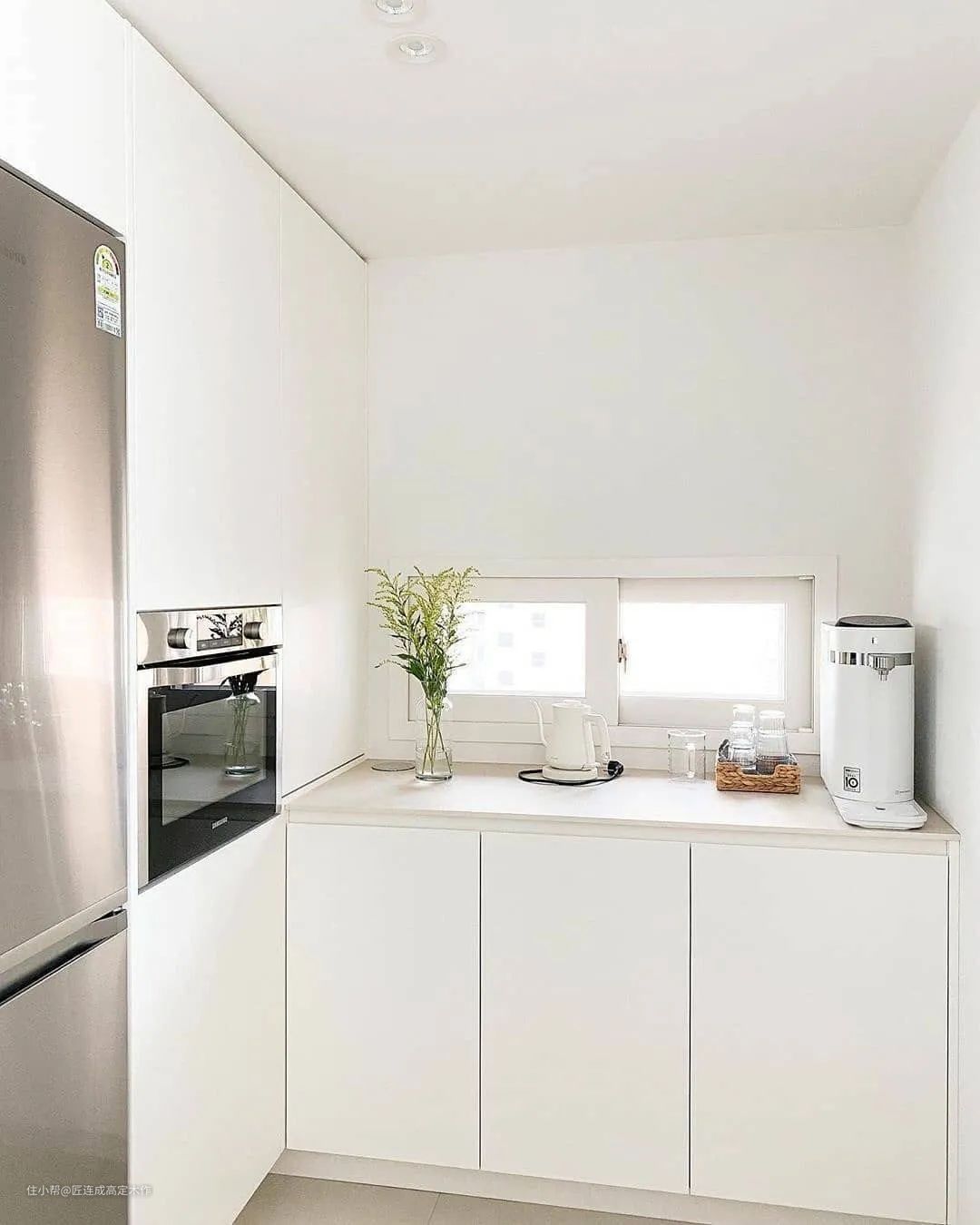 嵌入式的冰箱和烤箱不仅节约了空间,搭配隐藏式无把手的设计更是让空间简洁了不少。绿植则为空间增添了绿色生机,清新愉悦的心情油然而生。