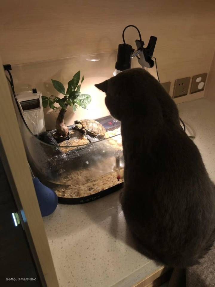 新一君刚来家的时候,我发现它喝水很少。于是我照着网友的经验给它准备了很多水碗,及时更换干净的水,但是从每天铲的猫砂来看,好像并没有起到太大效果。家里有了旺旺之后,我发现它很喜欢去喝乌龟缸里的水,经常一只脚踏在旺旺的晒背台上,吧唧吧唧喝得很欢。