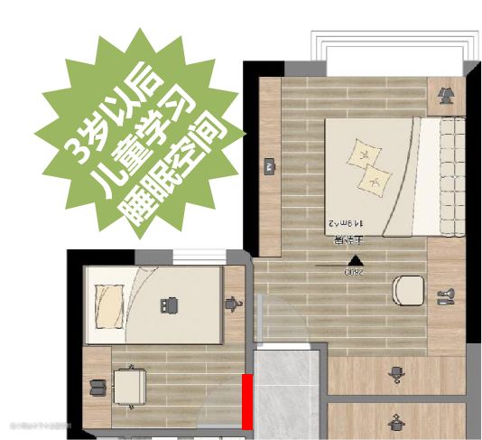 ▲ 像这个户型,通过将儿童房的房门移动到主卧内部,成功为主卧增加了一个儿童成长空间,方便父母夜晚照看,也将父母与孩子更紧密的联系在一起。