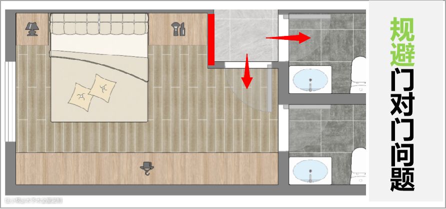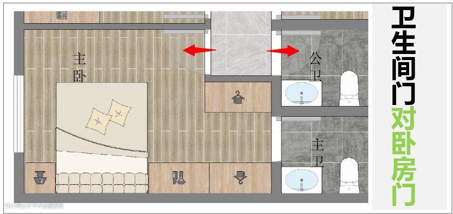 ▲ 主卧门正对着卫生间门,在风水上来说是有影响的,而且也比较尴尬。