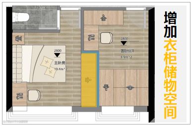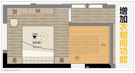 ▲ 小到连衣柜都放不下的卧室,可以向隔壁的客卧借空间,将墙体改成“5”字型,设计出一个凹位,就有地方嵌入衣柜、满足衣物收纳需求了。