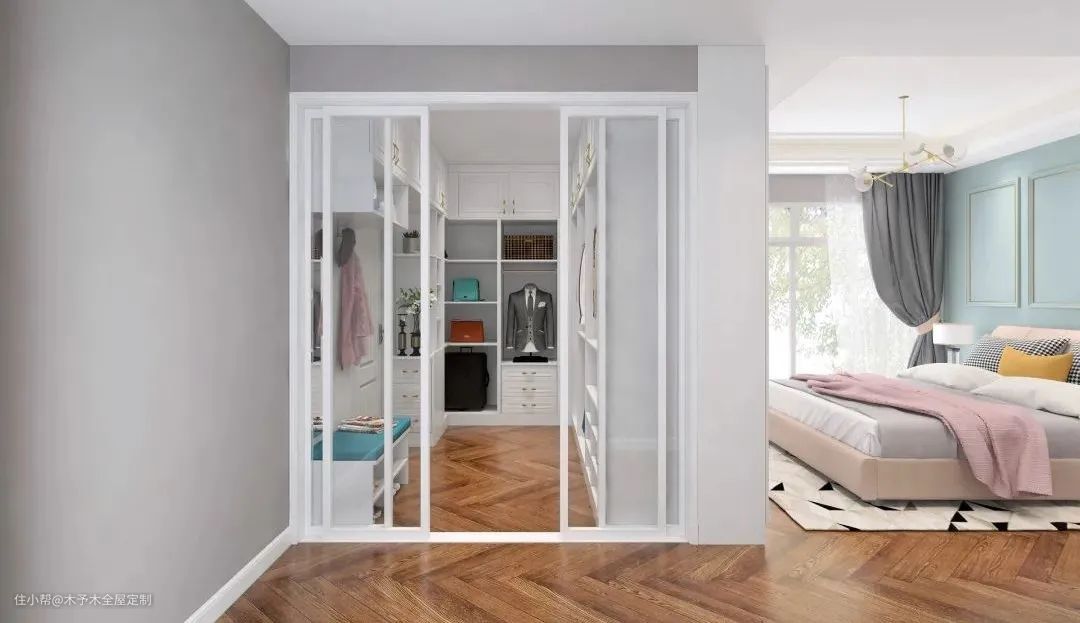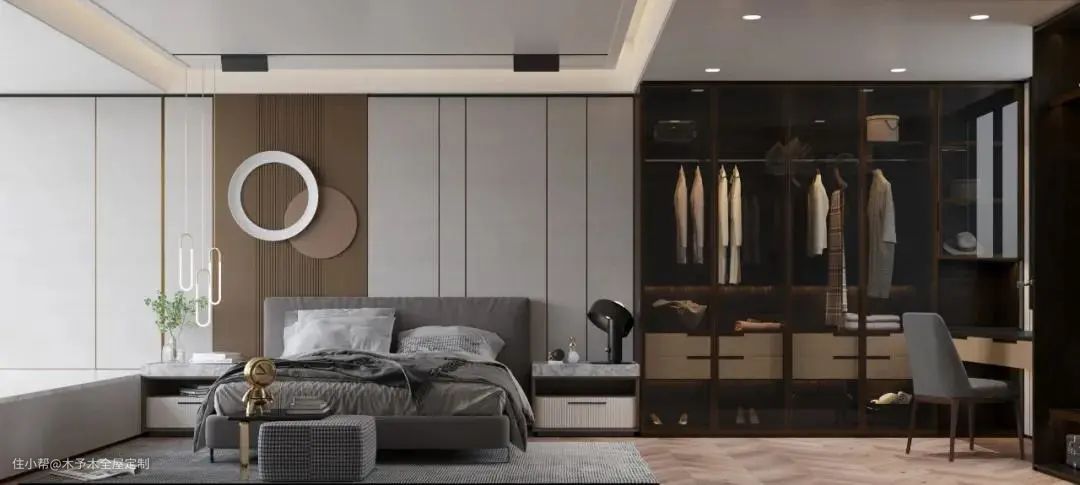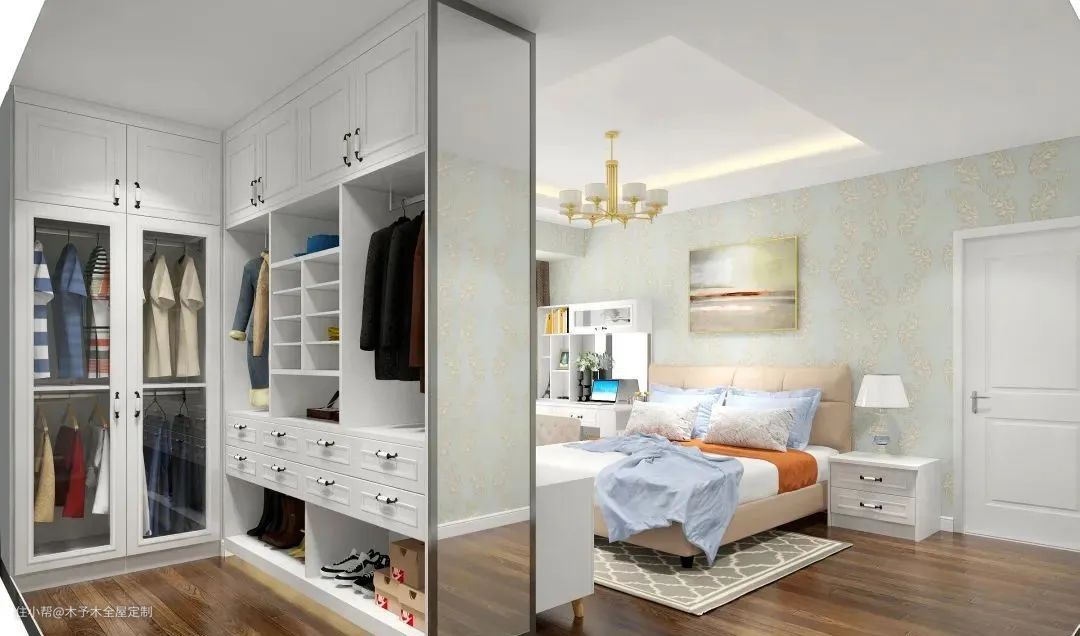 ▲ 大卧室的空间与其闲置着浪费,不如利用墙体+柜子组合,在床尾宽敞的部分隔出一个独立衣帽间,收纳能力比整墙衣柜更强大。