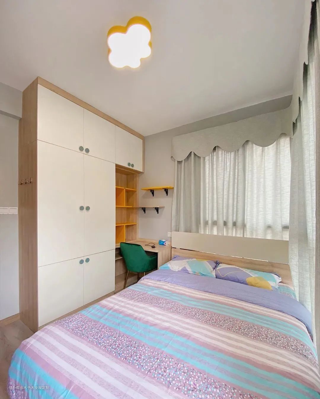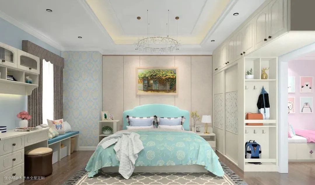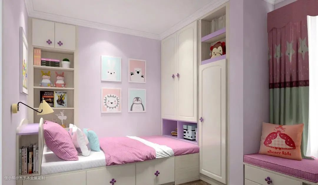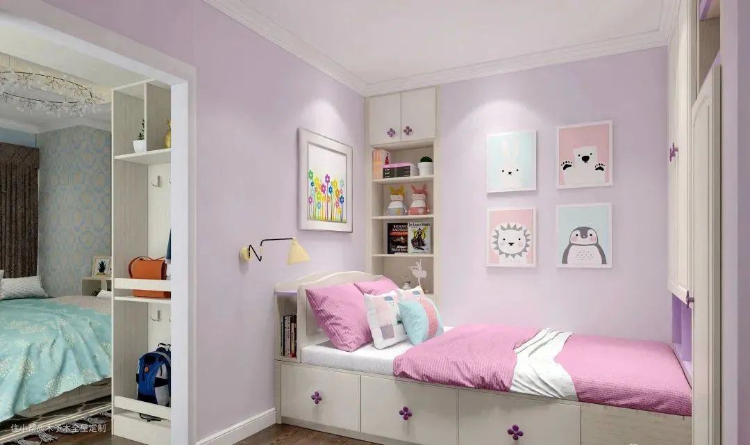 ▲榻榻米+嵌入衣柜的一体化设计,储物空间非常充足,收纳孩子的衣物、玩偶绰绰有余。充满童真的挂画,给孩子营造快乐的成长空间。