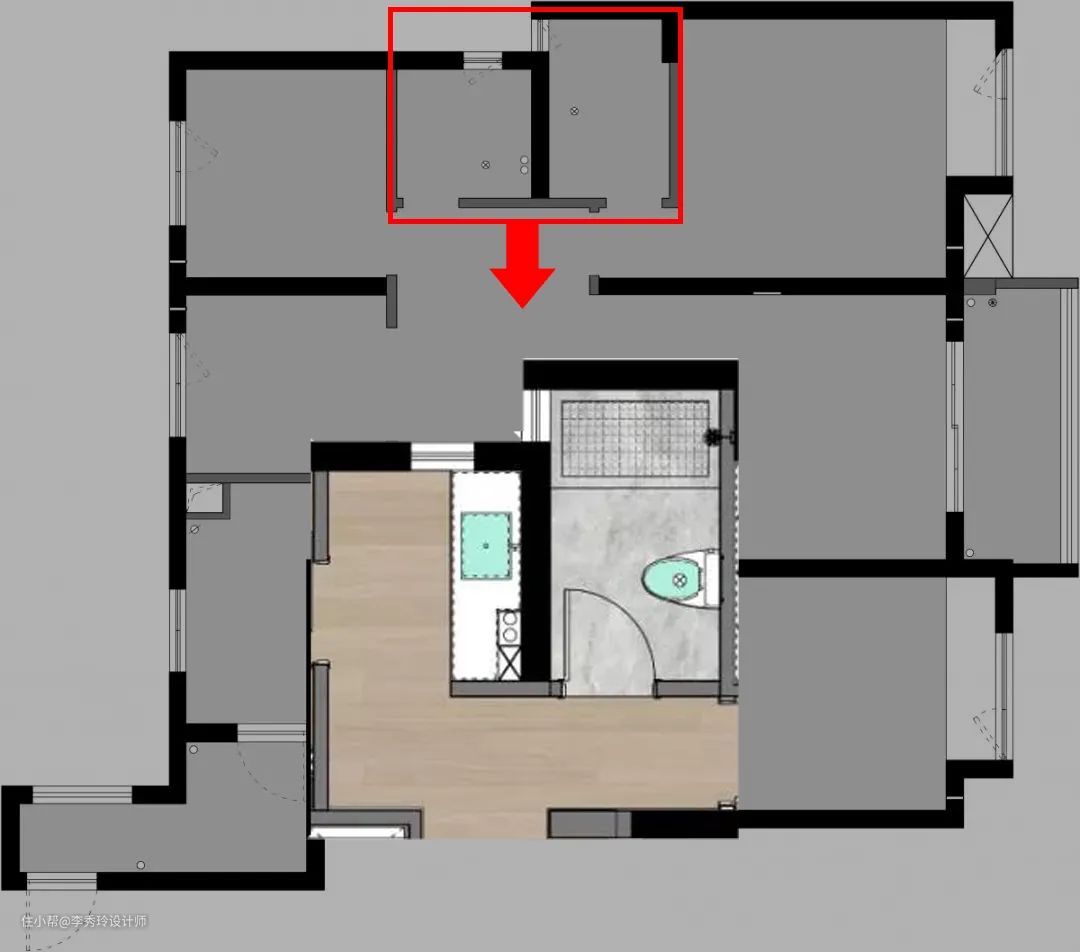 ①两个卫生间并为一个,面积变大,用起来更宽敞舒适。
