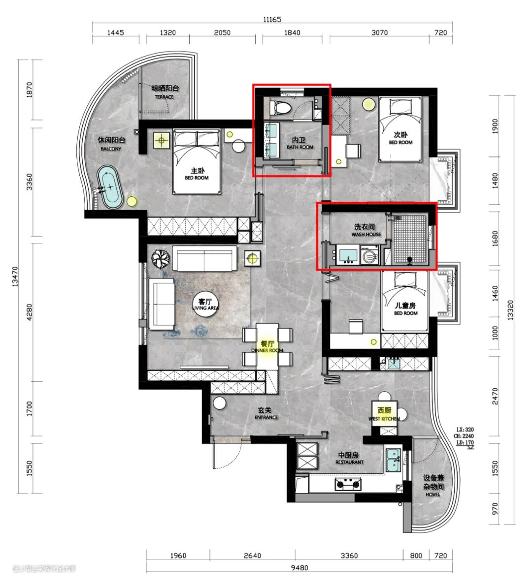 ②洗衣区设计在客卫,处于全屋中心位置,动线最短。