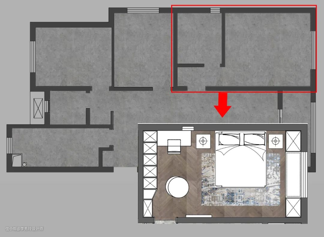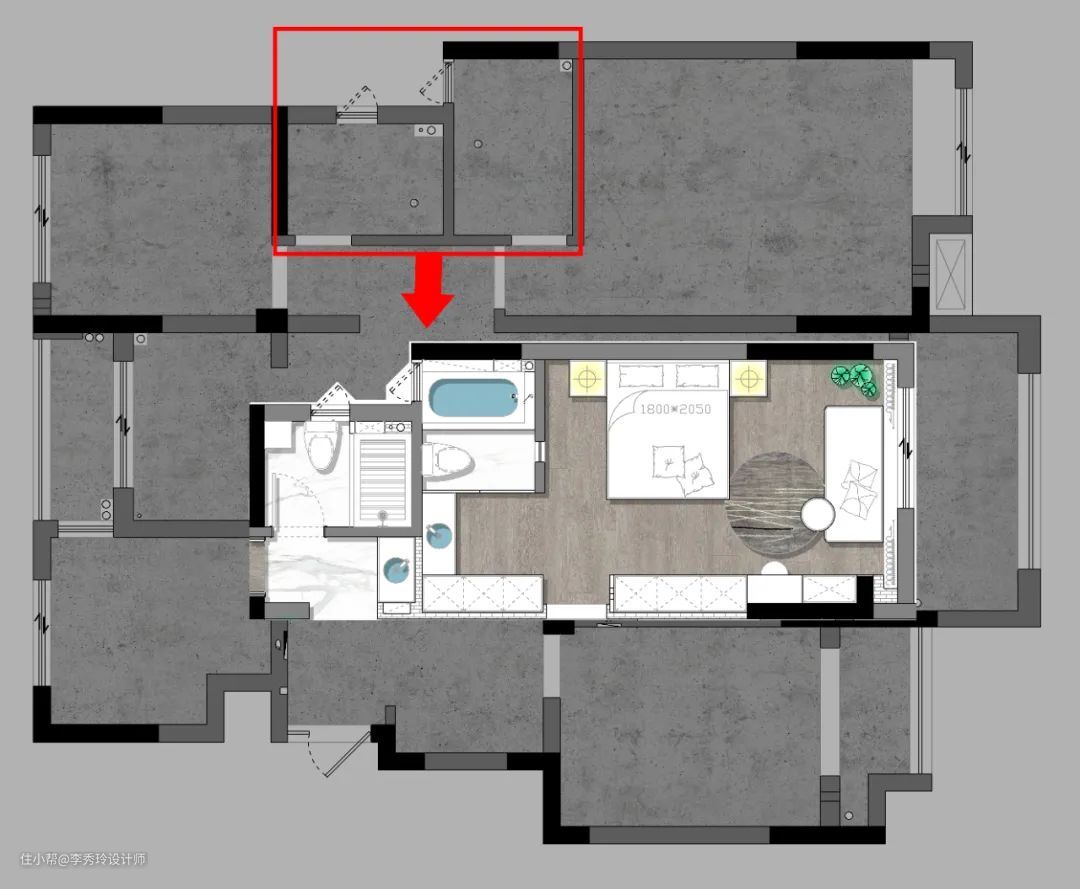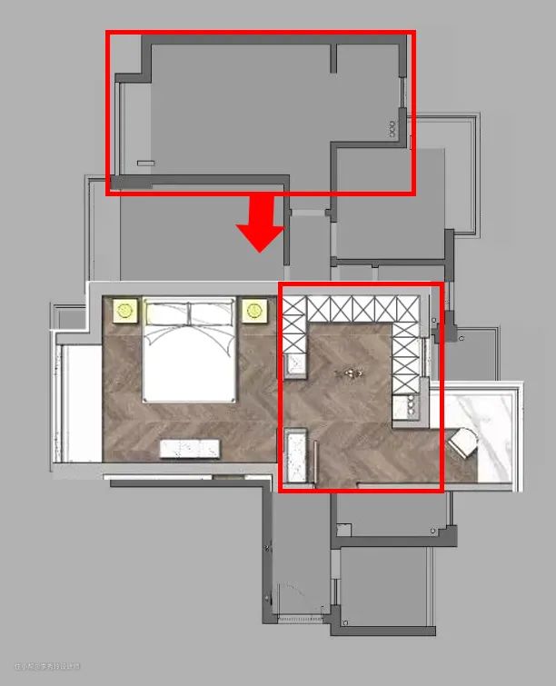 将主卫拆除,面积扩入主卧,提高卧室面积与室内通透度,并可以将此设计为休闲区。