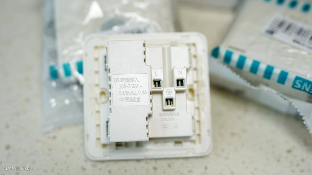 质感这个东西,看照片真的无法体会,拿到手上才有那种感觉,整体面板是亮光的白色,材料十分好,西门子这款灵蕴辰曦白用料应该是在我拆解过的所有开关插座里面质感排名在前三的了,整体十分光洁,反光度很好,颜色也很整体统一,没有一点瑕疵,用料很纯