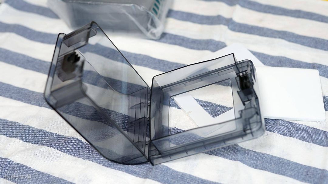 防溅盒本身结构简单,底部是线槽,方便插头插电之后,线从这里出来,需要注意的是防溅盒有两种,开关防溅盒和插座防溅盒,插座防溅盒的空间会大一些,也可以开关使用,推荐购买防溅盒的各位,都买插座防溅盒通用开关,这款防溅盒是西门子IP55的新品,线孔这里是胶条的密封设计,实测密封性很好