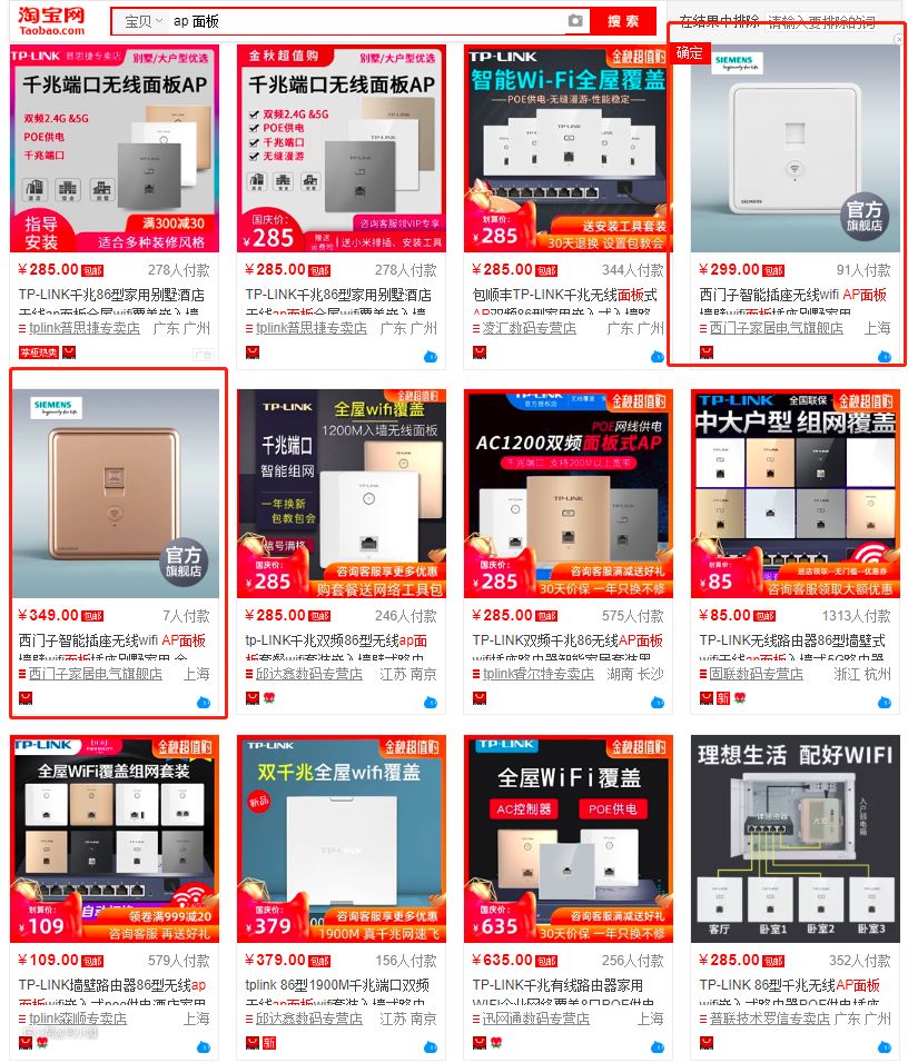 在万能的马云家输入 AP 面板关键字,出来的基本上全部都是TP-link的POE供电的产品,两个排名很靠前的西门子的 AP面板进入了我的视线