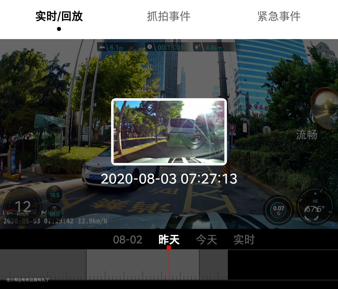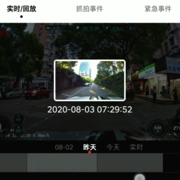 另外一个比较常用的功能就是视频回放,可以通过app拖拉进度条的方式,观看前几天的视频记录。一般而言,这个功能其实没有什么用。笔者喜欢无聊的时候连接一下行车记录仪,看看过往几天经过的地方,当时的景色天气,也能听到车厢里和人说话的声音、播放的音乐等等(不要在车里做坏事)。就像时光倒流一样,有的时候还觉得挺好玩的。当然,在万一发生交通事故的时候,视频回放就非常管用关键了。