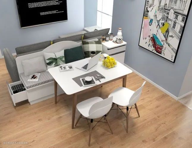 卡座自带靠背的造型,使其拥有天然的隔断功能。另外,能坐能装的卡座不仅“省空间、强收纳”,还能加强户型空间的有效利用,妥妥是小户型的福音!