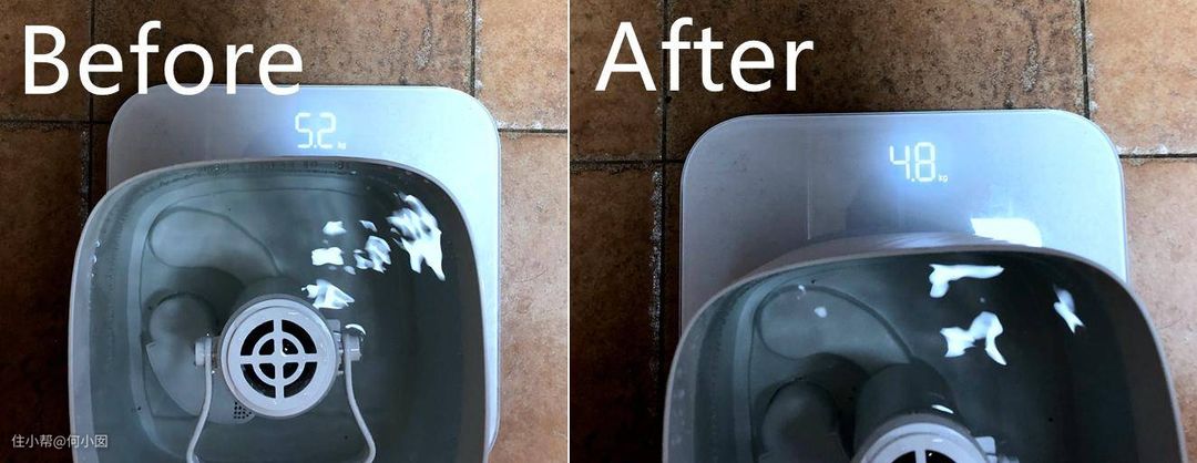 这一小时内,水箱消耗如何呢?经测试消耗掉0.4L左右的自来水,舒乐氏的水箱大小为4.5L,按照测试结果,一个满箱的水,足够使用12小时左右,实际上会远远不止,因为设定恒湿之后,到达设定湿度,小白鲸会自动停止加湿,低于设定湿度,才会又开始工作,我实测满箱水,设定恒湿60%,小白鲸可以在10平米的房间大概工作20小时左右,当然,这与当地的气候和湿度也息息相关,总之官方介绍的一箱水使用一整天,是绰绰有余的