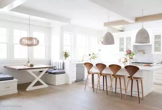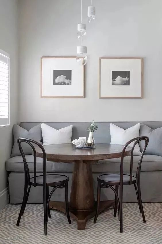 当然如果觉得卡座靠墙的椅子不方便移动,想让这个组合更加自由的,你也可以试着将座椅替换成小沙发或长板凳,再搭配几个柔软的小抱枕,也会让你的身心感到愉悦。
