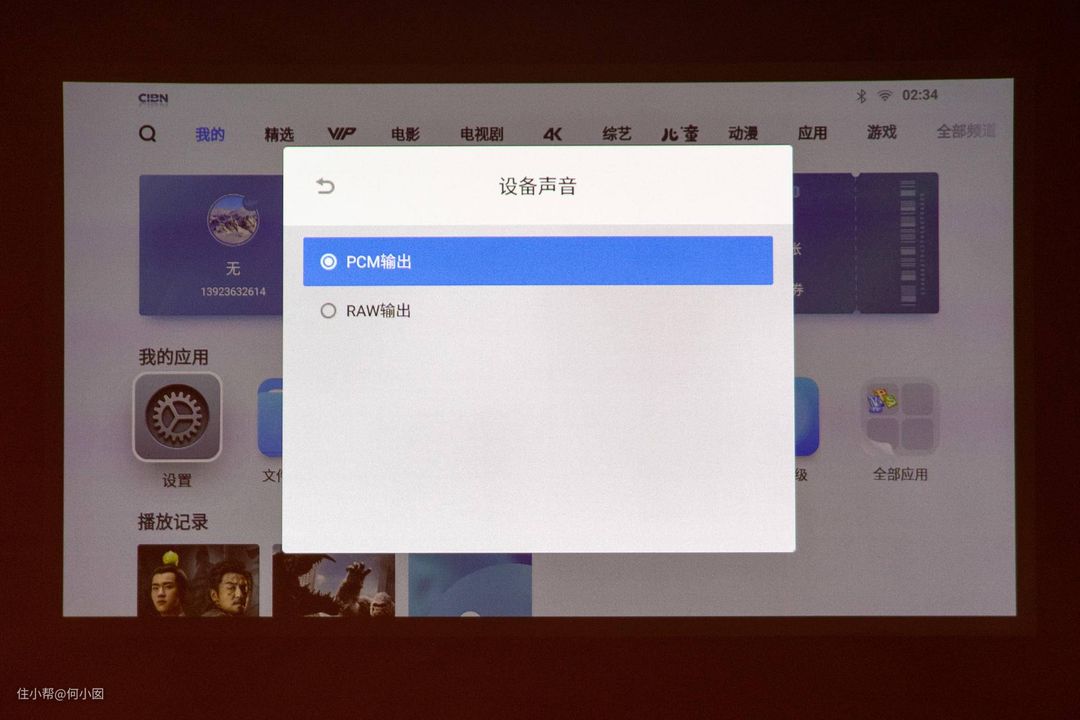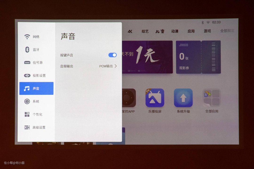 控制声音大小在遥控器和手机上都能操作,还可以在界面上遥控是否开启按键声音,设备声音的输出。这款投影仪还支持光纤输出,和3.5mm耳机孔公用一个接口,可以接功放进一步提升音质。