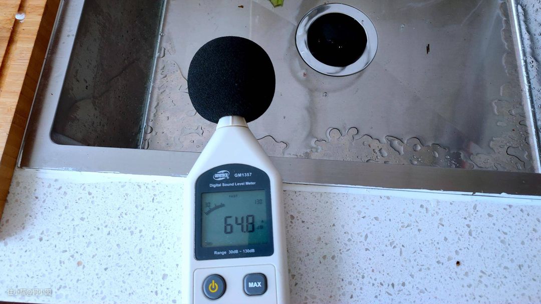 垃圾处理器的噪音可能大家都比较关心,空转距离很近,噪音在64.8分贝左右,与人大声说话的音量相似