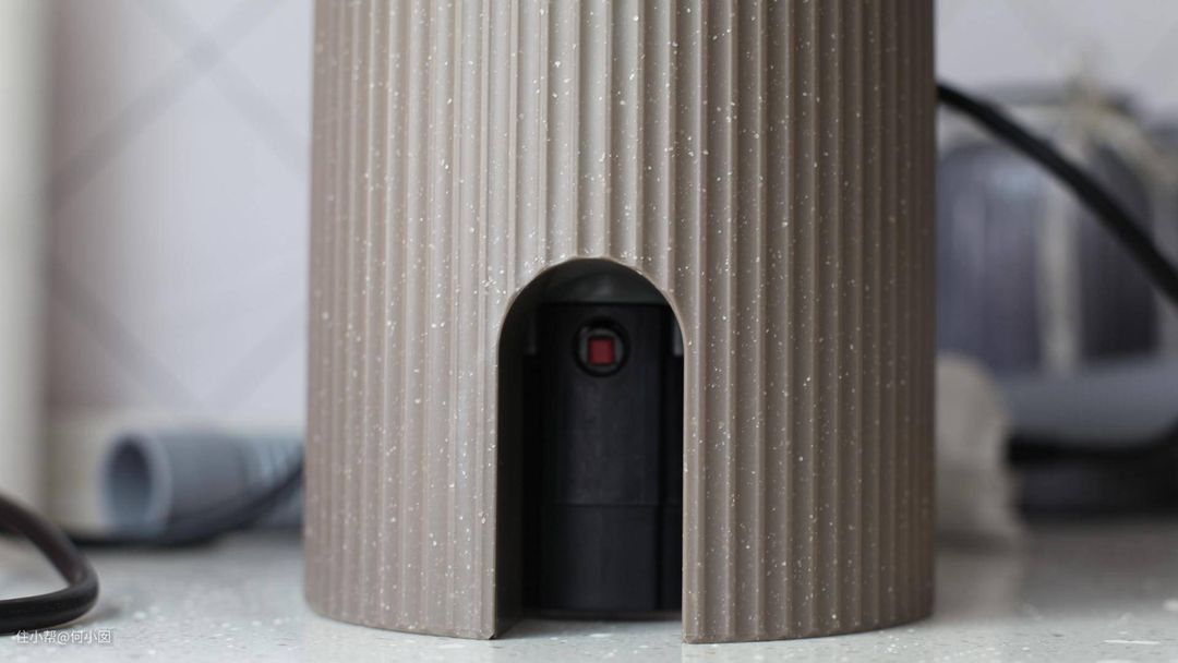 这个灰色高颜值的圆柱体,就是美的的垃圾处理器C38B,表面处理有点像橱柜台面,有一些斑点的花纹,并不是单纯的灰色