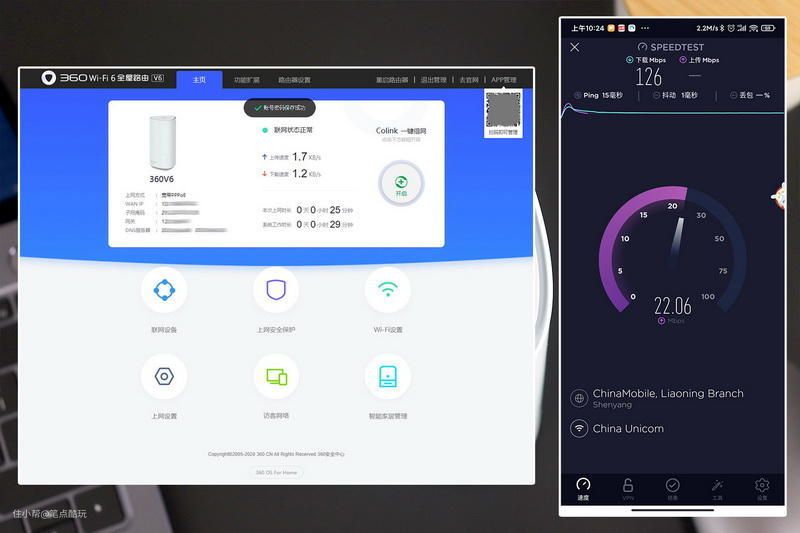 如果是初次使用360的路由器,按照指示进行配网有2种方法,把主网线插入WAN口后,一种方法是用网线直连电脑,打开浏览器,在Web管理页面按步骤操作;另一种不用连网线,通过手机WiFi接入指定的360字样的SSID,之后按步骤配网。此外,在手机安装360家庭防火墙APP,将会实现无线端的全网安全管控,像防蹭网、访客网络管理、远程拉黑疑似“偷网设备”、给儿童上网设备设置限速等等,功能非常全面。下图左是刚联网后的PC端Web管理主页,右图是手机接入新局域网的WiFi后,用Speedtest测出的网速,上行15Mb/s,下行126Mb/s。