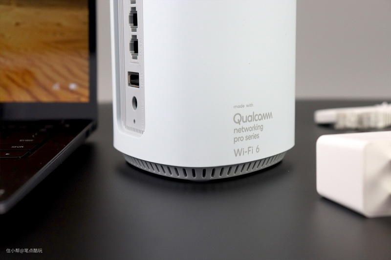 侧面印有WiFi6字样,标明Qualcomm networking pro series,内部搭载了高通Qualcomm IPQ6000五核处理器,同时用4颗信号放大器增强无线发射功率和接受信号的灵敏度,并将单台路由器的WiFi覆盖范围扩大,可以通过多台路由器互联,实现大平层、多层别墅、复式Loft等大户型的全屋网络覆盖,比WiFi5的网速提升50%以上。