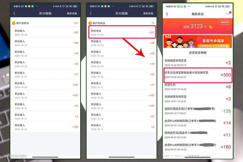 下面说说“会赚钱的路由器”。我从10月16日使用京东云·360WiFi6全屋路由开始,到这篇文章写完的10月25日,有效记录期的8天内,实际“占得便宜”571京豆,其中第一次用500积分兑换500京豆。