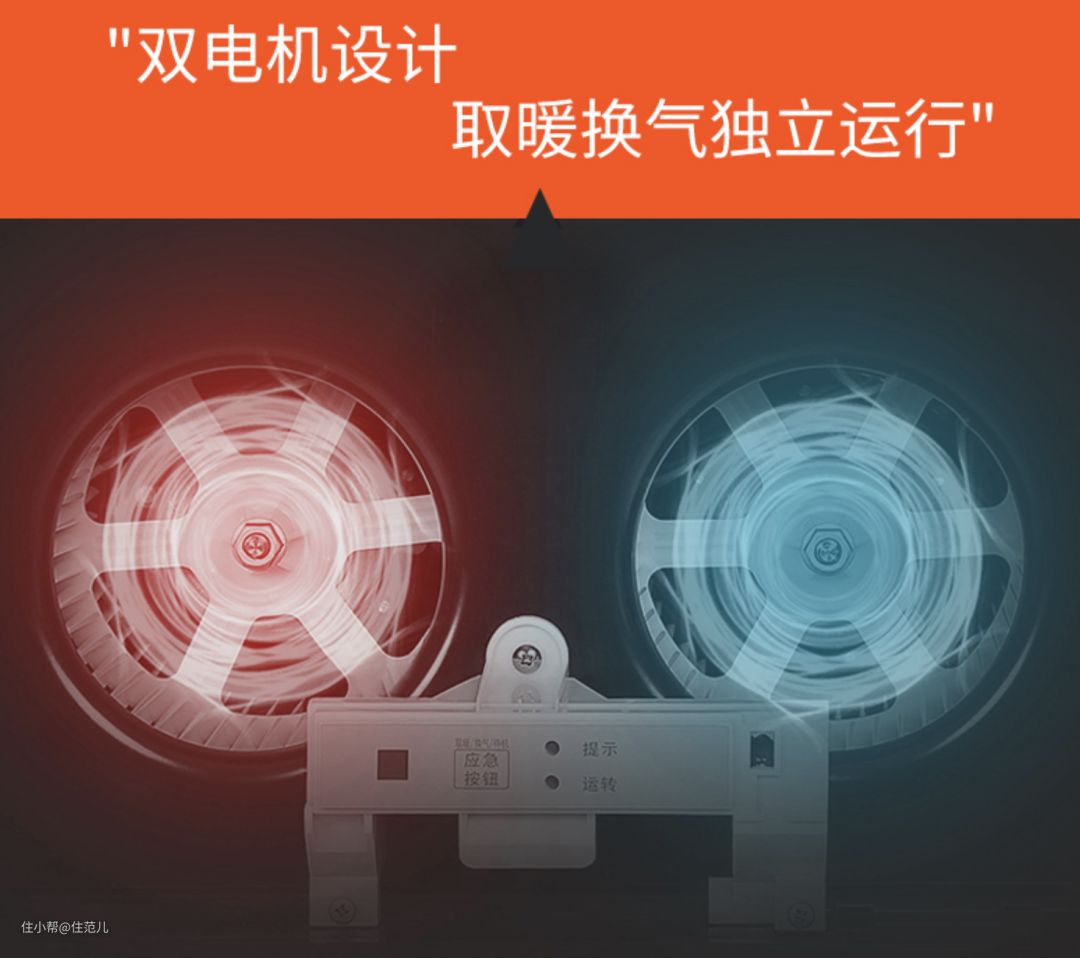 双电机就可以取暖+换气,照明、制暖、干燥、换气、热/凉风都有,加了抗菌滤网。