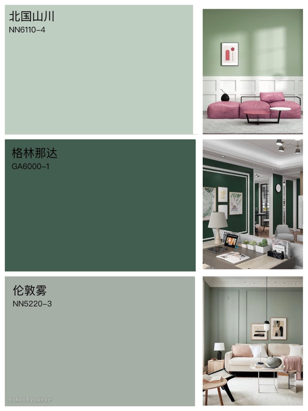 伦敦雾是我最水心的颜色,特别正宗的灰绿色,饱和度低很养眼。冰海航船有复古感,做背景墙很有古典韵味。