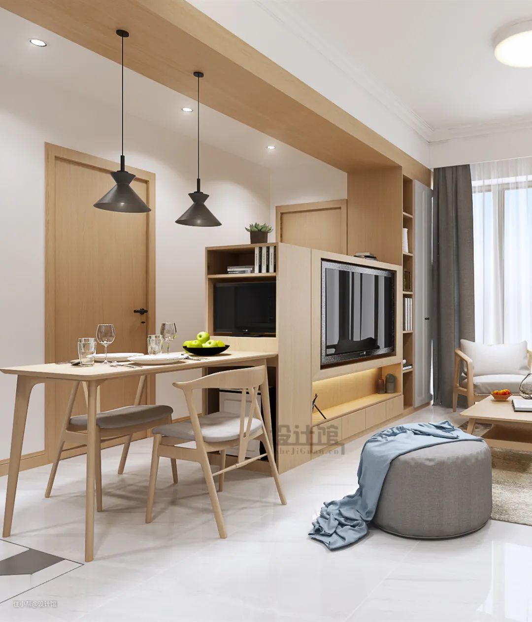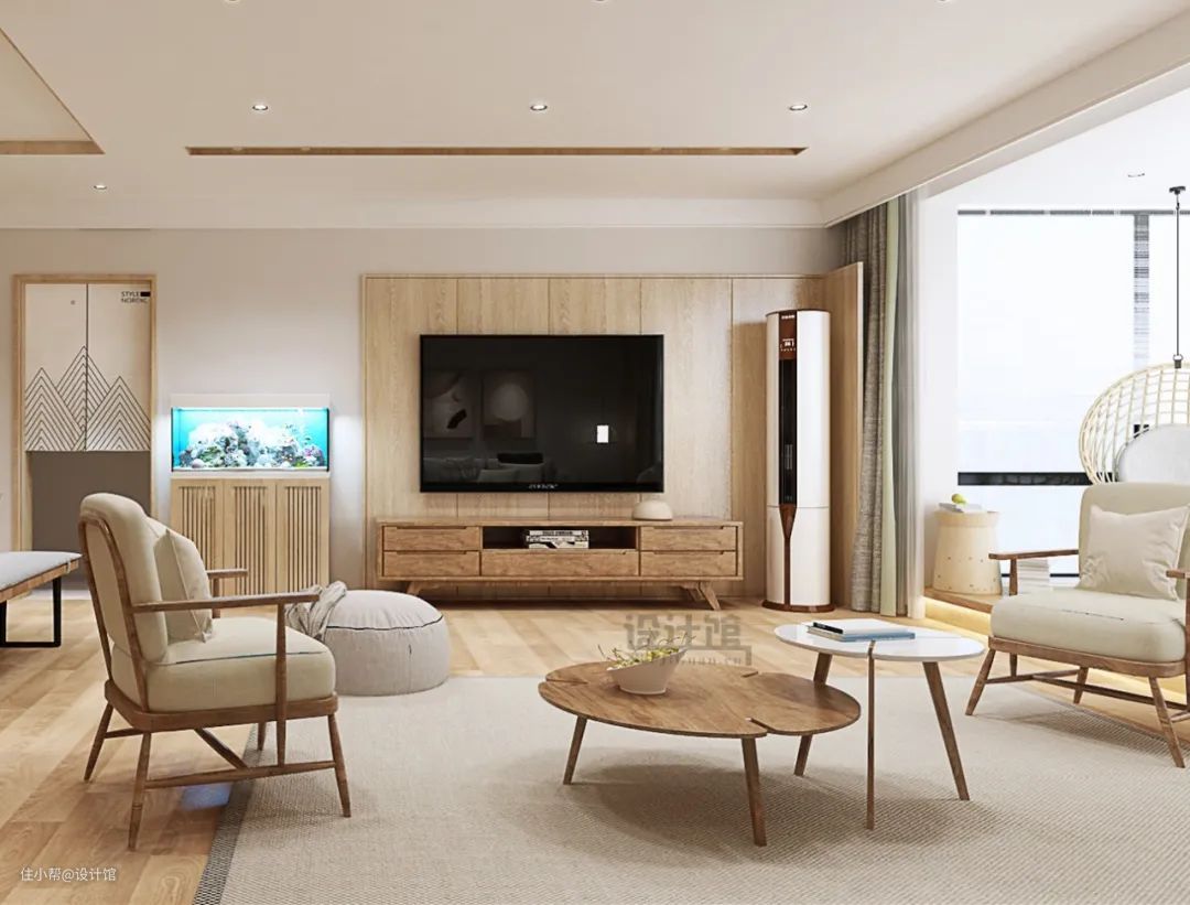 以木饰面来作为电视背景墙的主要材料,这样大面积的木质感搭配,一般在简约日式、原木北欧等风格用得较多。