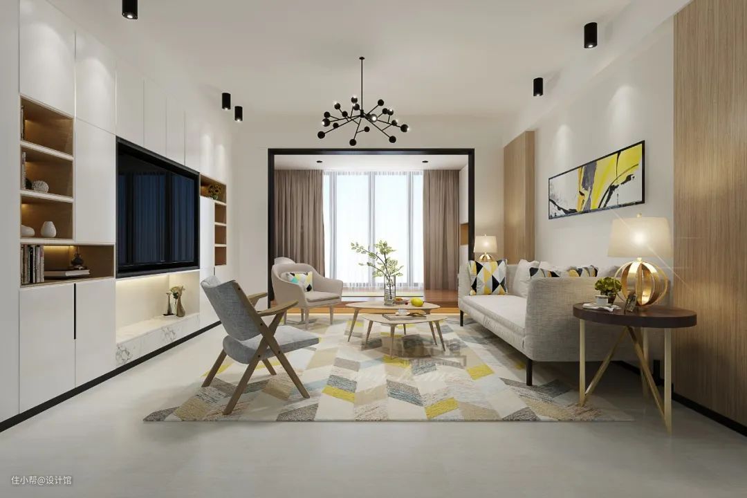 太多的木质感会让空间显得偏向简约北欧这种文艺范,在相对现代风的客厅空间中,为了保持空间的现代时尚感,同时提升空间的温馨舒适气质,可以在沙发墙两侧加入木饰面造型,对称设计既美观也让空间更加自然轻松。
