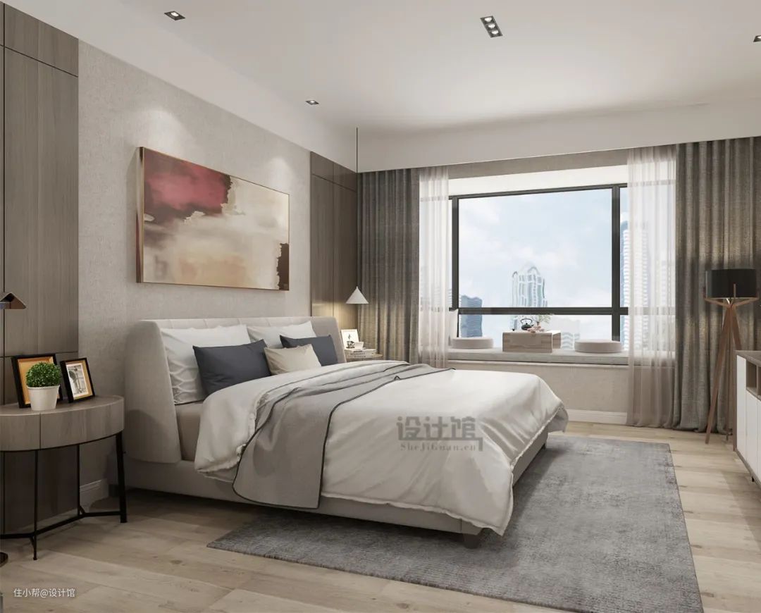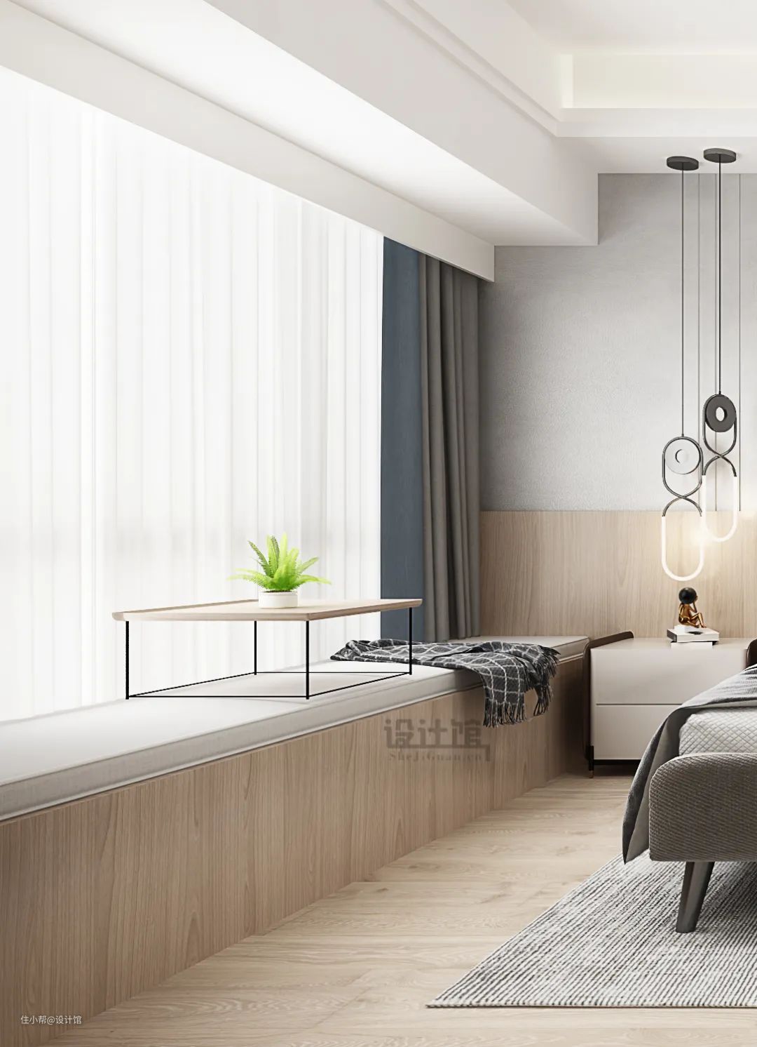 跟沙发墙、电视墙类似的效果,床头两侧加入木饰面的设计,可以靠放床头柜,做成对称的设计效果,让卧室显得更加档次高级。