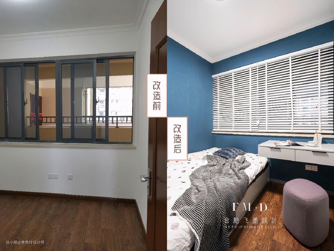 最后打通卧室与北次卧,设计衣帽间;原始的北次卧虽然有窗户,但朝向连廊,采光差,打通后提升整体采光效果。