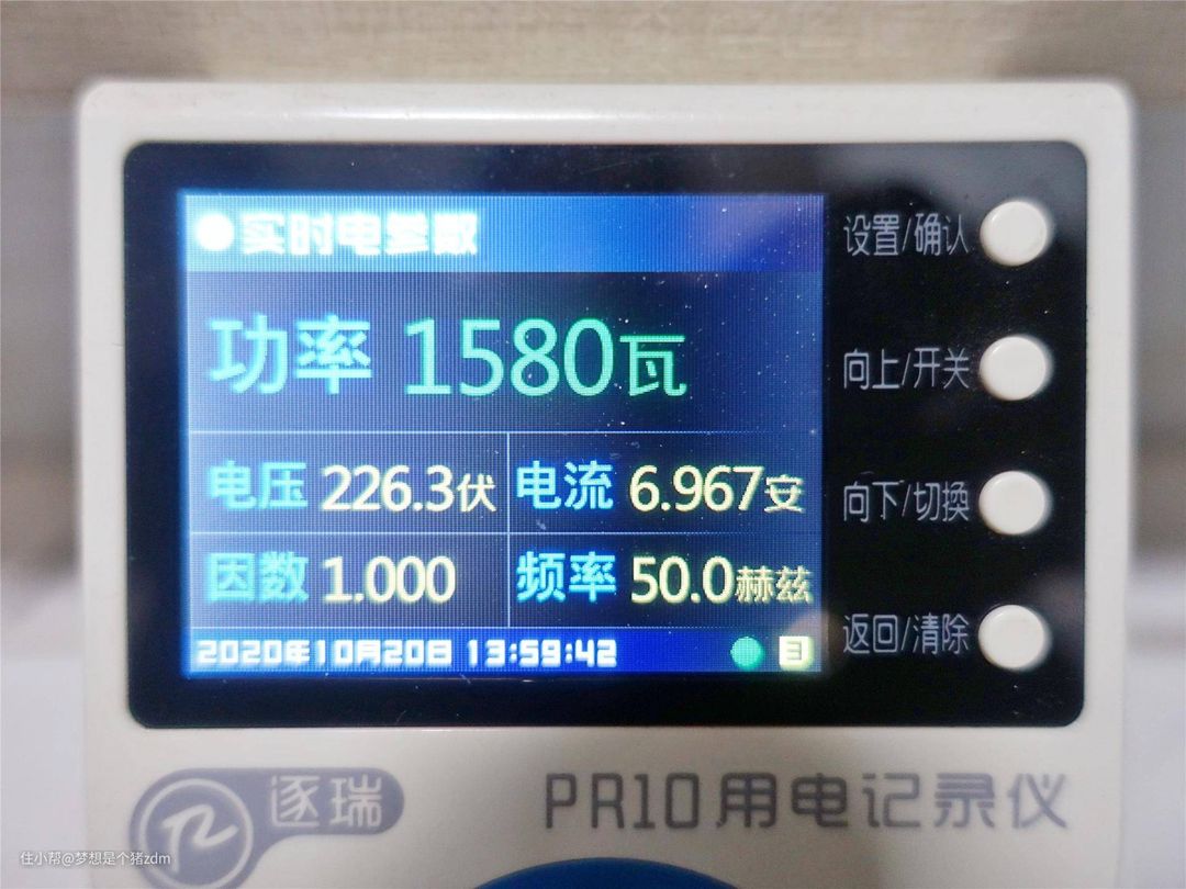 这是这台净水器在加热情况下的实时功耗,约1580W左右,机器内部水箱容量为2.5L,将2.5L常温水加热到预定温度需要6分钟,约需要0.158度电,按照我们长沙居民用电标准计算,花费约0.1元。