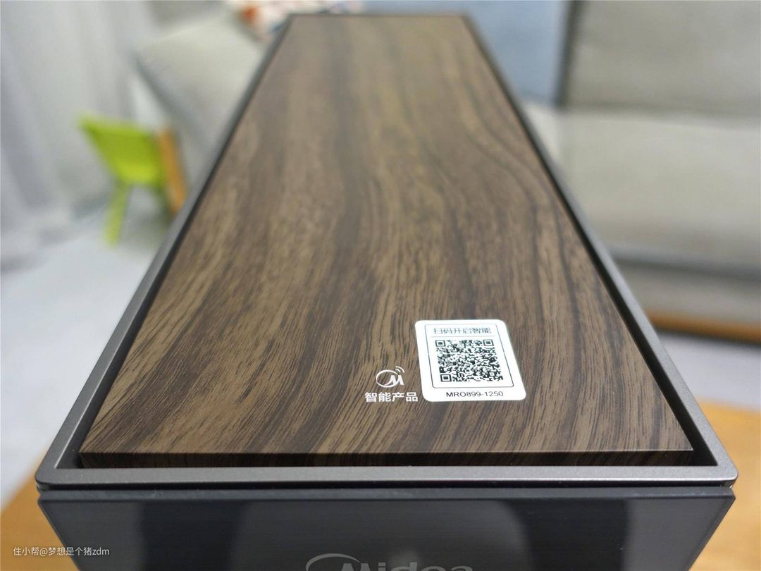 顶盖采用了木纹设计,智能产品四个字的标识表明了这款净水机能接入到美的美居APP中。