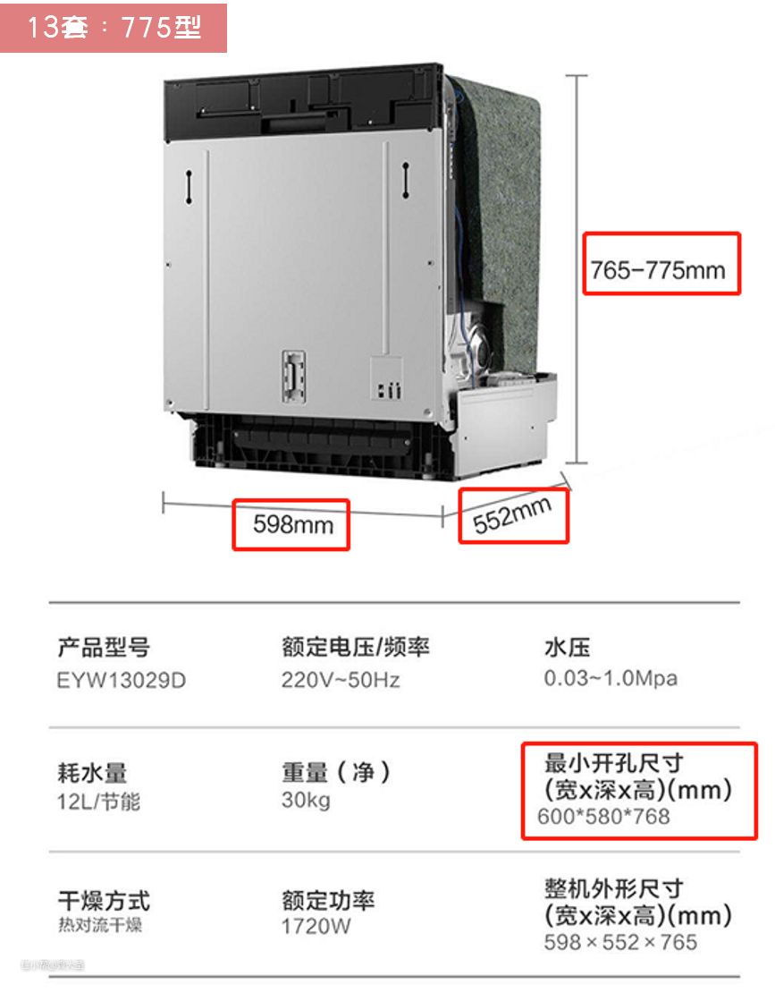 由于嵌入式洗碗机的大小基本都模块化了,深、宽一般都在600左右,根据套数不同只在高度上略有区分。以13套洗碗机为例,市面上主要分为820型和775型(均为去掉顶盖后嵌入的净空高度820mm/775mm)。