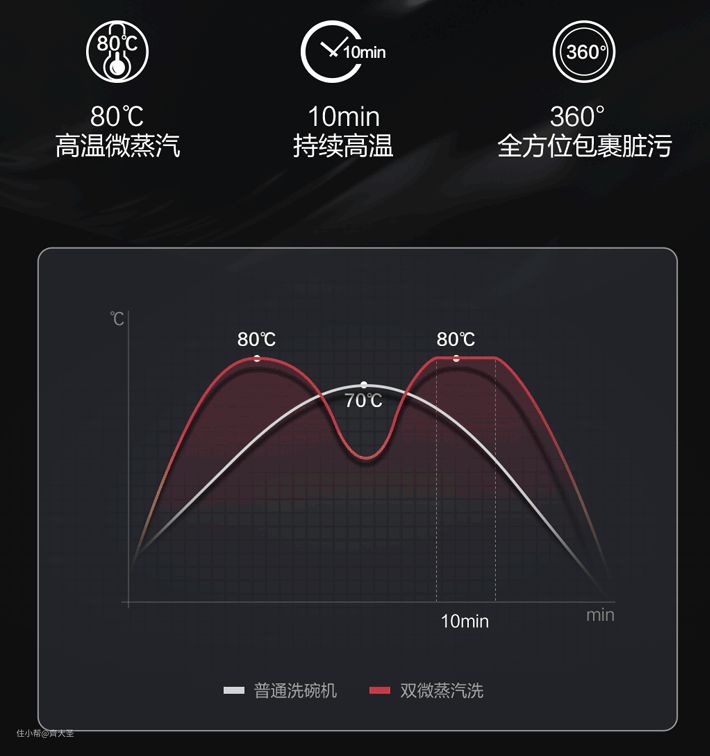 在高温微蒸汽洗的基础上升级高温双微蒸汽洗,煮洗和漂洗皆上升,80℃高温持续10分钟,高温微蒸汽包裹餐具分解粘重油污,洁净更透彻。