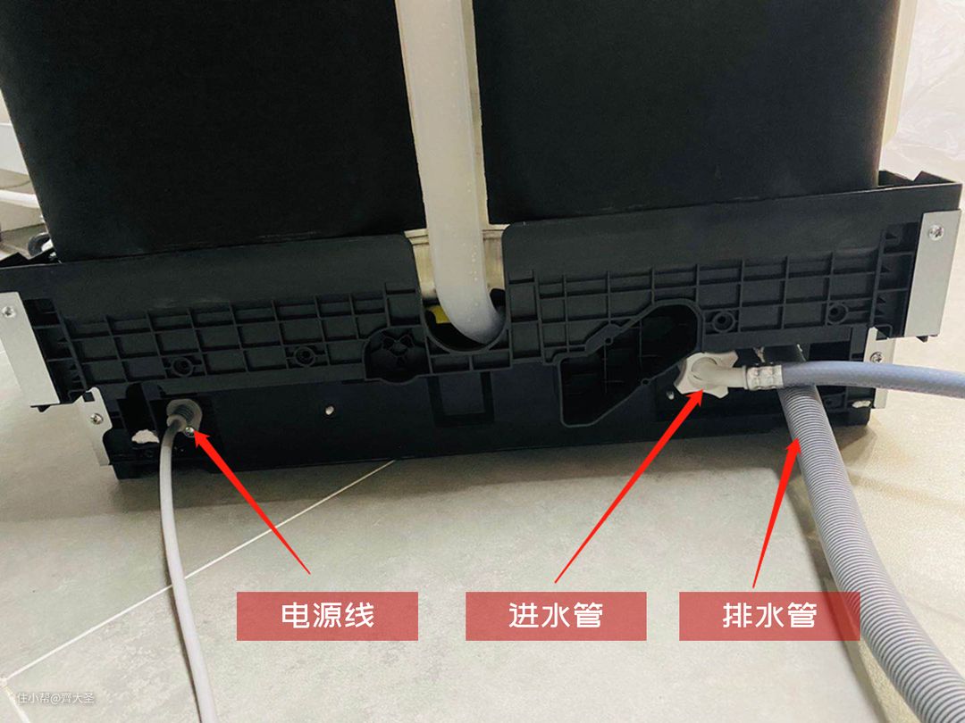 从下图可以发现,洗碗机与外界连接的只有三根线路:一根进水管(冷水)、一根排水管、一根电源线。
