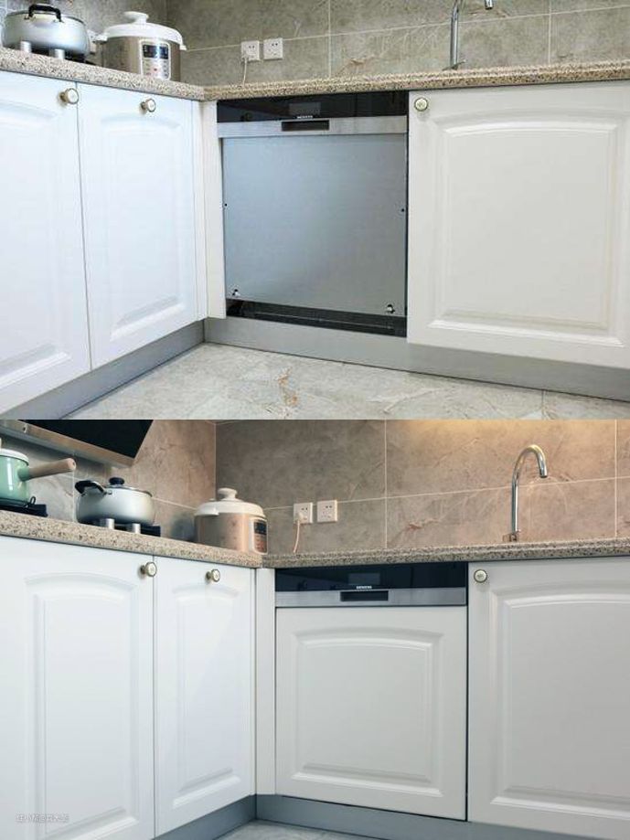 无论是水槽式还是橱柜式,都要在装修时预留好尺寸,最好在橱柜排尺前确定好洗碗机型号(无需购买),这样尺寸更精准,嵌入后更美观。
