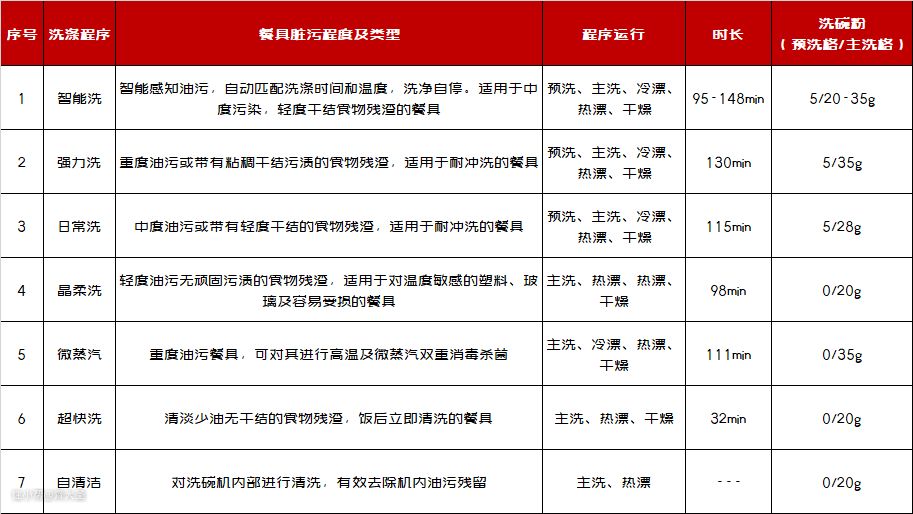 以海尔这款洗碗机为例,针对不同的餐具及脏污情况,内置了7套清洁程序。