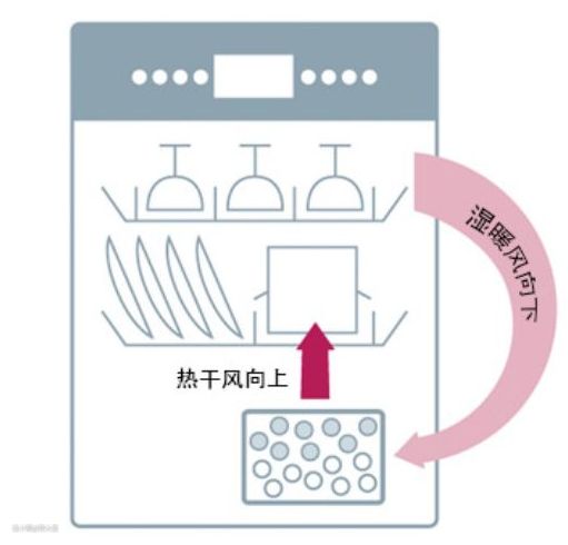 具备了冷凝烘干和热交换烘干的两种优势,还带有加热系统,可以直接吹出热风对碗碟进行烘干。类似于吹风机吹干头发的原理,将餐具表面的水珠直接吹干。烘干时间短,烘干效果好,但是能耗要高一些。