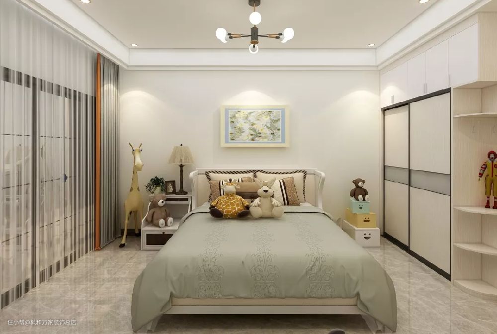 次卧色彩相对于主卧来说明亮一些,小面积的颜色出现在软装处,提亮空间色彩。