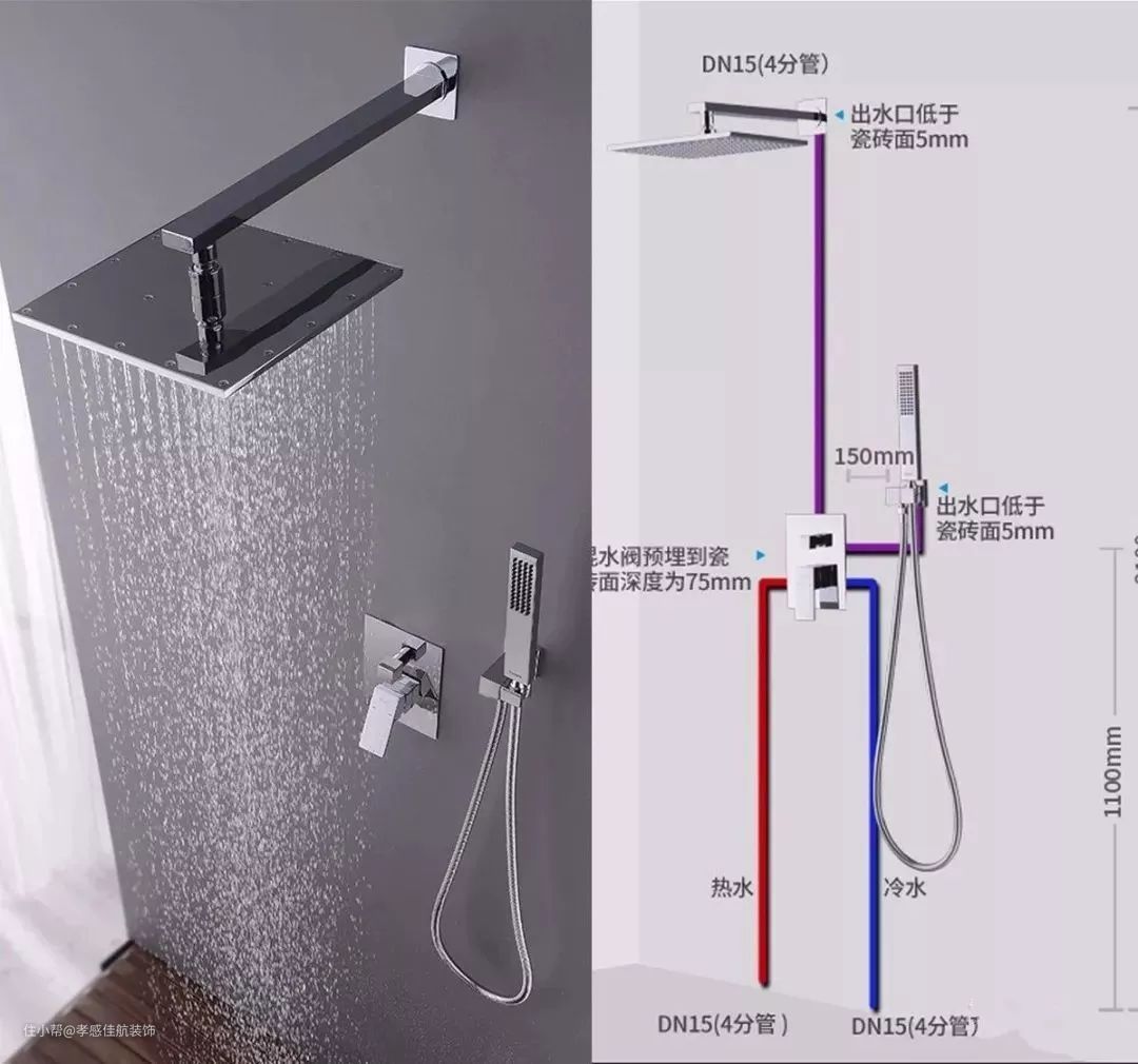 进水管埋进墙里,混水阀露在外面,是现在最普遍的安装方式。