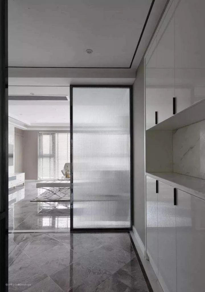 为了保证玄关有一定的私密性,又不想要完全阻挡空间的光线,在玄关这个位置,就可以使用这种透光不透视的压花玻璃了。压花怎么选,是选复古一点,还是现代一点的,就可以根据你整体空间的感觉来就好。