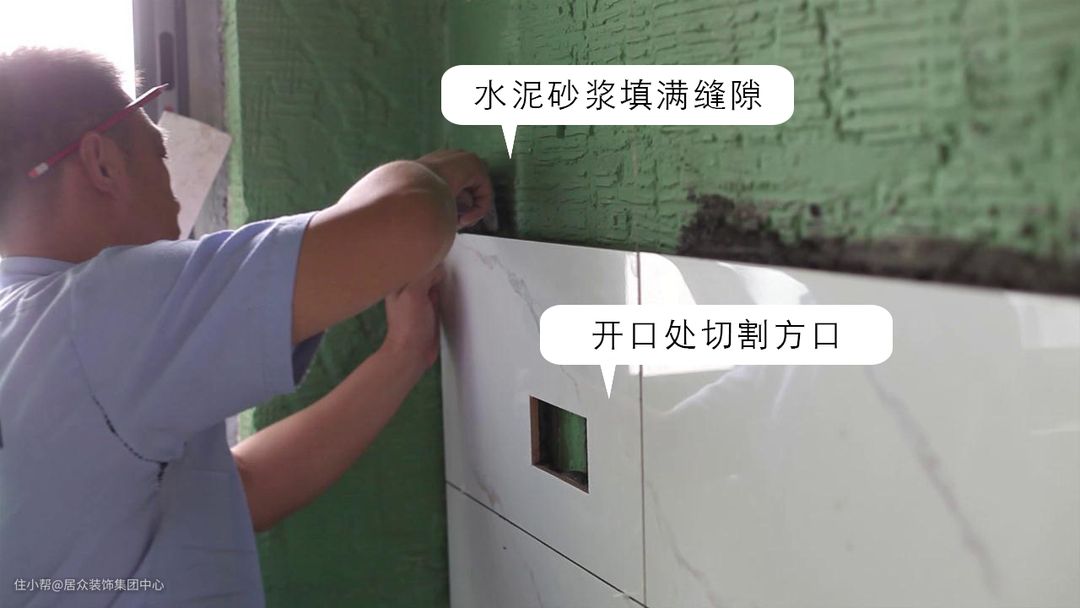 铺设至阳角时,将瓷砖切割45°角,在水位、电位等开口处使用切割机切方口。圆形钻头钻圆孔,每一排砖铺贴完成后,需要在顶部用水泥砂浆填满空隙,避免空鼓。