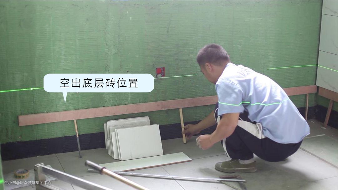 墙砖铺贴时需要空出最下面一层砖,使用水平仪定位,用木方空出最底层砖的位置,从第二排开始铺贴。