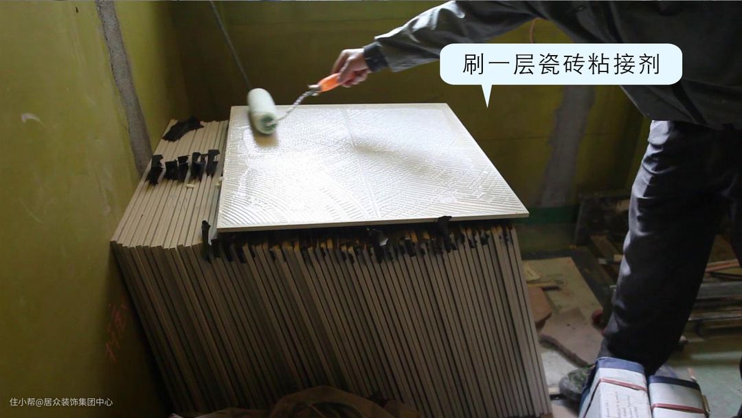 如果是大理石等非陶瓷材质,需要背面涂刷一层瓷砖粘接剂,以加强铺贴时的牢固性。