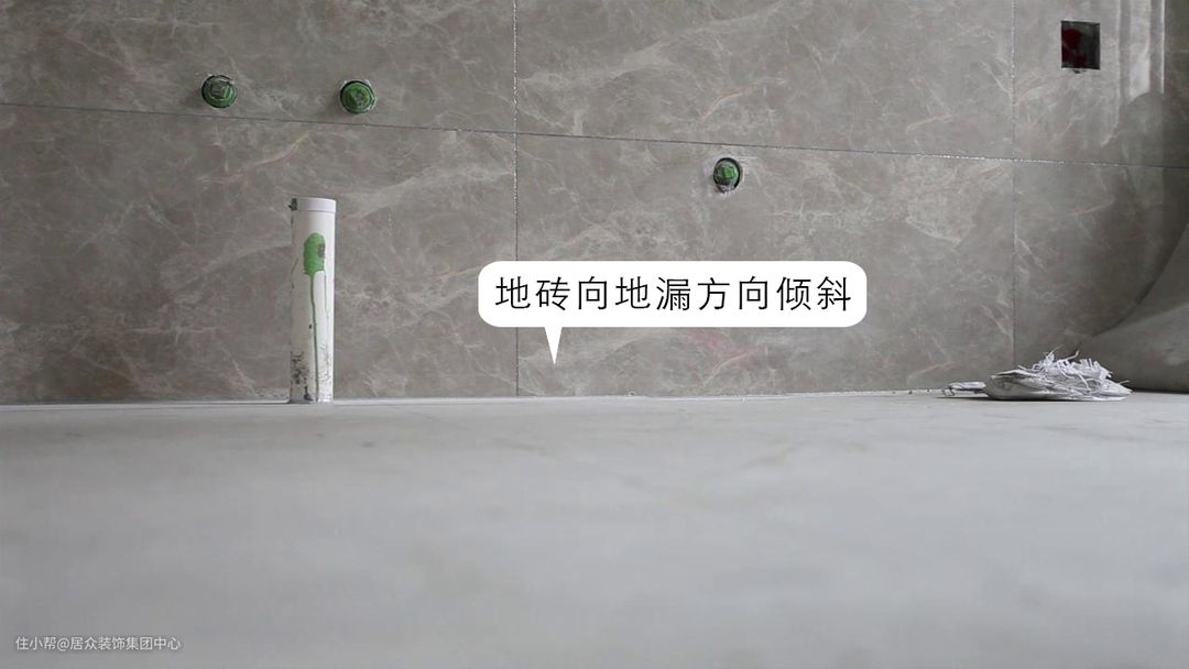 地砖铺贴方式与客厅地砖铺贴基本一致,需要注意的是,卫生间地砖需要向地漏方向有0.5%至1%的倾斜,地漏采用八字角安装,待瓷砖铺贴完成,使用专用填缝剂填缝。