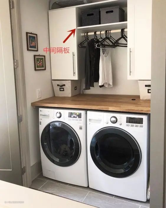 洗衣机上方是个好地方,吊柜加隔板用来收纳