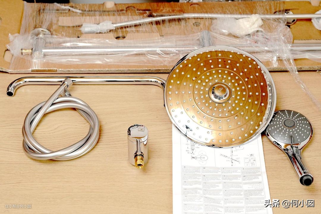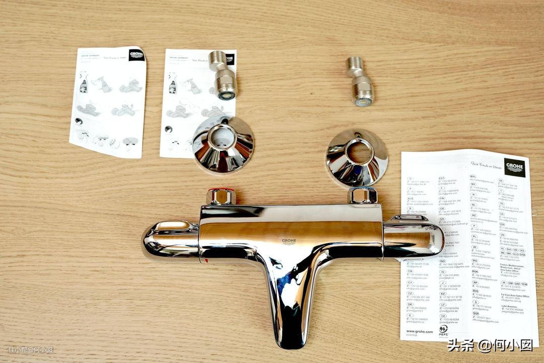 一起来看看这款高仪恒温冷触花洒的真面目吧,收到的时候是两个盒子,我就直接拆包了,来看里面的部件,这是恒温龙头的盒子,拆包之后,里面有一个带下出水的恒温龙头,两套配件和说明书