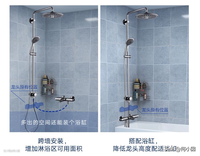 拆旧之后就开始比划安装了,一边拆师傅一边跟我说,这款高仪花洒是分体式的,比连体式的更方便,如果我家旁边有浴缸就可以把龙头跨墙安装在浴缸上面,如果下面本来接浴缸,就可以把位置放低,正好适配浴缸,像下图这样,我贴上来给新装修的小伙伴参考