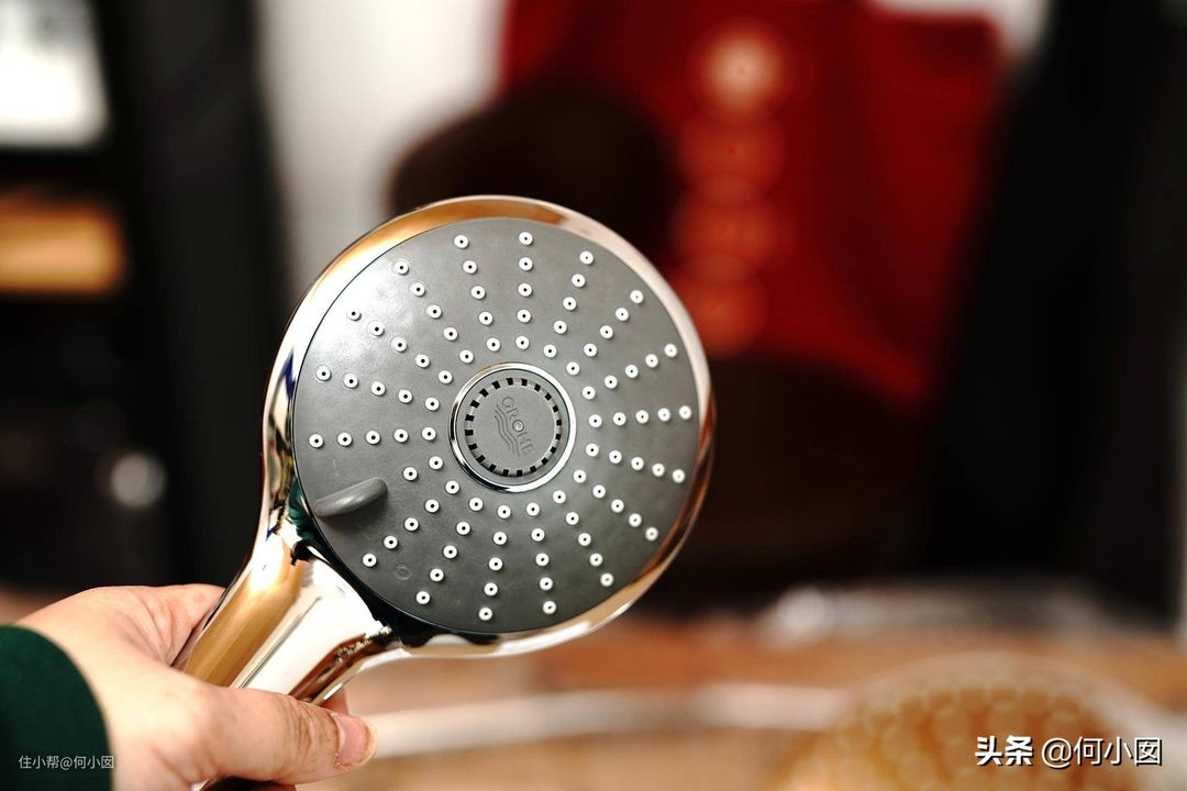 不用像使用以前老花洒只有120mm直径的顶喷,洗个澡还需要挪来挪去,才能全身冲到水了,你们看这个老花洒出水的状态就是因为用久有水垢,水垢堵塞出水口了,水量变小,而且喷射方向不一致